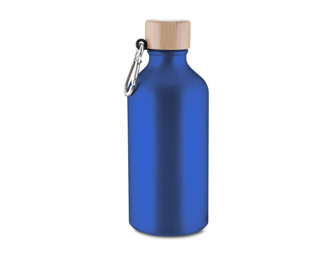 Garrafa de 550 ml em alumínio reciclado com acabamento mate, exceto na cor branca, tampa rosqueável em bambu e mosquetão na tampa.